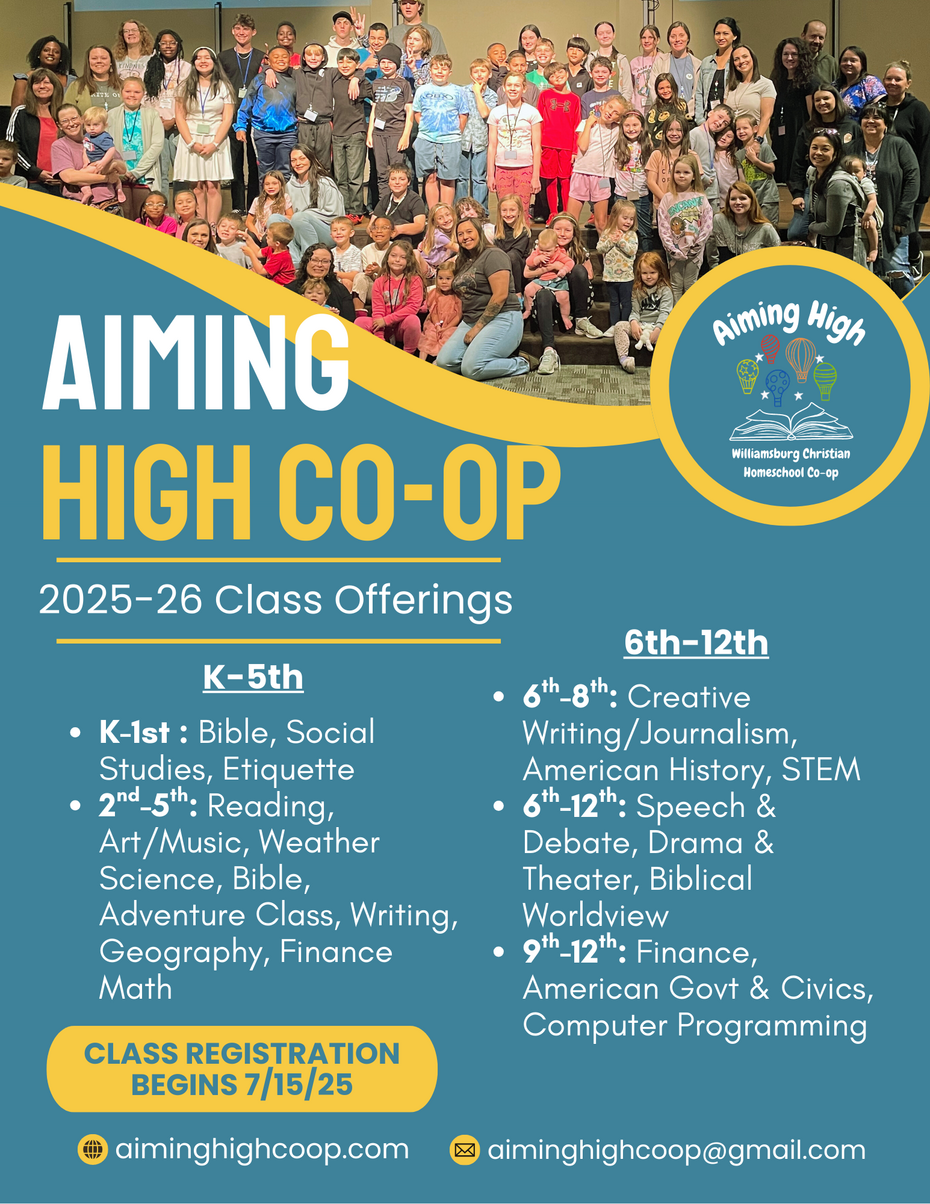 Aiming High Homeschool Co-op is a faith-based homeschool group that serves the city of Williamsburg and the surrounding areas. We were created to fulfill a need in Williamsburg for Christian homeschooling families to come together to provide...